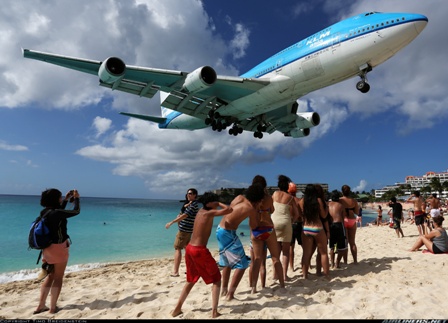 في شاطئ سانت مارتن الكاريبي الشهير ، تقف جموع السائحين منذ زمن بعيد يرقبون تحليق الطائرات و يترقبون لحظات الوصول و المغادرة لتلك الطائرات .