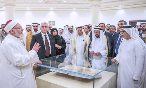 واطلع “القاسمى ” على المخطوطات المعروضة في بهو المبنى التي تضم أقدم المخطوطات الموجودة التي يعود تاريخها إلى القرن الخامس الهجري.