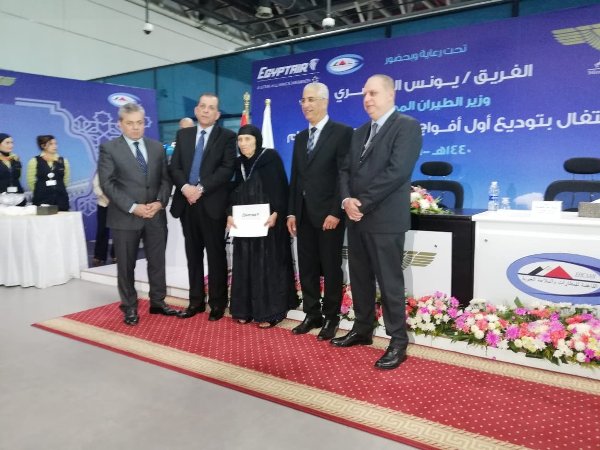 وقام بتسليمها الجائزة الطيار شريف عزت مساعد رئيس الشركة القابضة لمصرللطيران والطيار احمد جنينة رئيس الشركة القابضة للمطارات والملاحة الجوية والطيار أشرف الخولي رئيس شركة مصرللطيران للخطوط الجوية و المهندس أحمد فوزي رئيس شركة ميناء القاهرة الجوي..