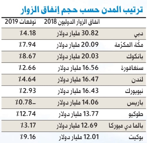 وبالنسبة لحجم الإنفاق بالدولار، تصدرت دبي القائمة حيث ينفق المسافرون 553 دولاراً أمريكياً في المتوسط. ولا تزال مكة المكرمة، التي انضمت إلى هذه القائمة في العام الماضي، تحافظ على المرتبة الثانية للعام الثاني على التوالي، حيث تفوقت على بانكوك التي جاءت في المركز الثالث.