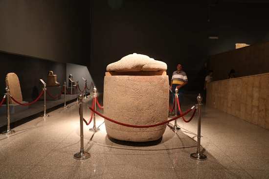 كما يضم المعرض ايضا صندوق كانوبي ملون يرجع للعصر البطلمي عثر عليه بمقبرة كاراخامون مما يفيد اعادة استخدام المقبرة.