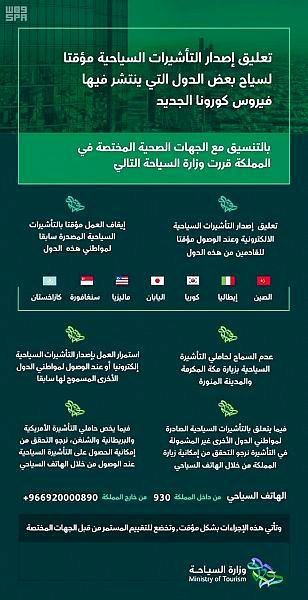 الرياض – قالت سياحة السعودية أنها بالتنسيق مع الجهات الصحية المختصة في المملكة قررت تعليق إصدار التأشيرات السياحية الإلكترونية مؤقتا للقادمين من 7 دول هى (الصين، إيطاليا، كوريا، اليابان، ، ماليزيا، سنغافورة، كازاخستان)، وعند وصول القادمين من تلك الدول .. كما قررت إيقاف العمل مؤقتا بالتأشيرات السياحية المصدرة سابقا لمواطني الدول المشار لها أعلاه.