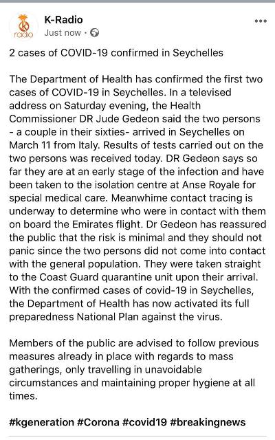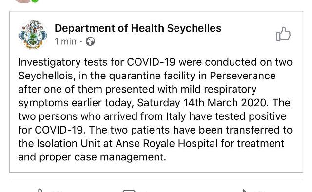 One Seychelles makes the urgent call for an open dialogue between the Head of State, leaders of the various political parties, and relevant authorities to address jointly the risks associated with the arrival of coronavirus in Seychelles, the necessary and pressing preventative measures the Nation must employ to ensure no further imported cases of the virus materialise, and the steps to b