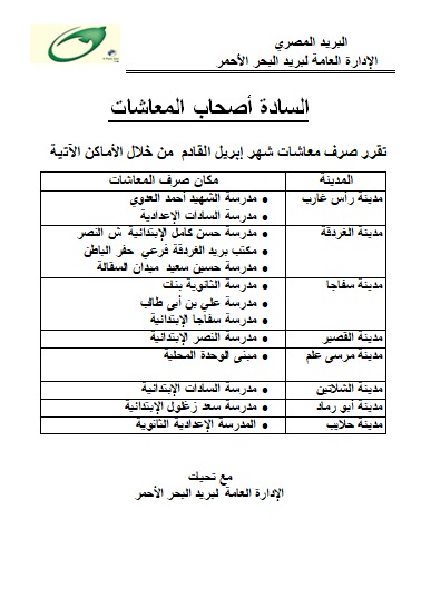 بدورها أعلنت الإدارة العامة للبريد بالبحر الأحمر جدول صرف معاشات شهر ابريل بحيث يتم الصرف لمن لهم مستحقات أقل من ألف جنيه أيام الأربعاء والخميس والسبت (1 – 2 – 4) ابريل، ومن ألف جنيه إلى ألفين جنيه، أيام الأحد والاثنين والثلاثاء (5 – 6 – 7) ابريل، وأكثر من ألفين جنيه يتم الصرف يومي الأربعاء والخميس (8 – 9) ابريل، ومن لم يصرف في أيامه المحددة يصرف إعتباراً من الأحد 12 ابريل، والسماح لكافة البطاقات المتوقفة بالصرف خلال الأشهر الثلاث القادمة.