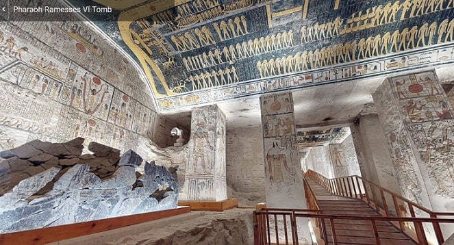 مرفق الرابط الالكتروني للزيارة الافتراضية التى تقدمها وزارة السياحة المصرية بالتعاون مع وزارة الاتصالات وتكنولوجيا المعلومات لمقبرة الملك رمسيس السادس بوادي الملوك