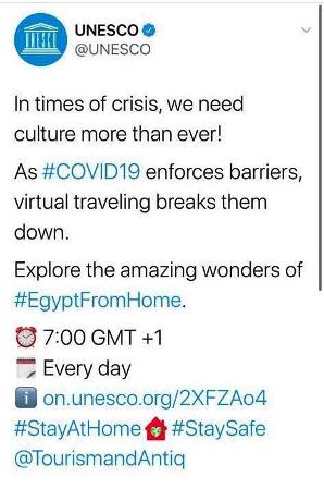 القاهرة – أشادت منظمة اليونسكو بمبادرة السياحة والآثار المصرية للجولات الافتراضية ” اكتشف مصر من بيتك ” ،والتى اطلقتها سياحة مصر أوائل شهر ابريل الجاري ، جاءت الاشادة في شكل تغريدة لليونسكو علي موقع التواصل الاجتماعي توتير .