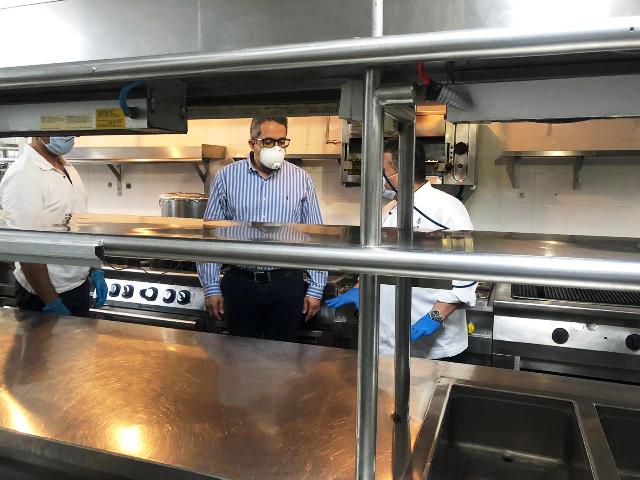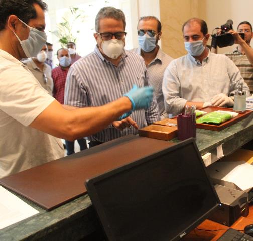 وقام العناني بتفقد الإجراءات الوقائية التي تتبعها هذه الفنادق منذ دخول الضيف من باب الفندق وإجراءات تطهير الأمتعة وقياس درجات حرارة الضيوف وتطهير اليدين، ومنطقة الاستقبال والبهو وإجراءات التسكين ومنطقة المطاعم والمطابخ والبرجولات وحمامات السباحة، والممرات الداخلية والممشى الخارجي و منطقة الشاطئ.
