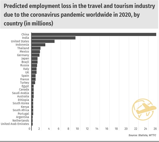 This pandemic is expected to cause an enormous employment loss in the global travel and tourism industry, throwing more than 100 million people out of work. The three hardest hit countries, China, India, and the United States could lose almost 40 million jobs, according to data gathered by LearnBonds.