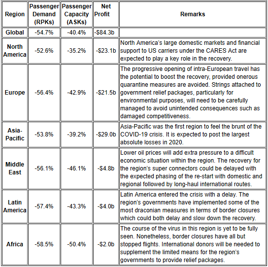 All regions will post losses in 2020. The crisis has taken on a similar dimension in all parts of the world with capacity cuts lagging about 10-15 percentage points or more behind the over-50% fall in demand.