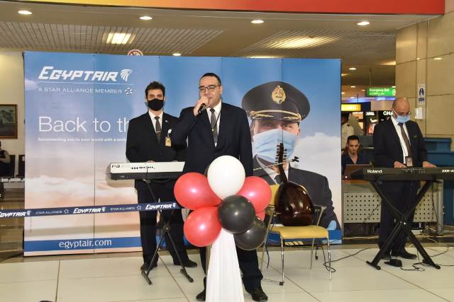 وقد حرص العاملون بمصر للطيران من أصحاب المواهب الفنية علي استقبال المسافرين بالمطار بتقديم فقرة فنية تتضمن موسيقي وأغاني وطنية ترحيبا بالعملاء وتعبيًرا عن سعادتهم باستئناف حركة الطيران مرة أخري وسط جو يسوده الأمل والتفاؤل بتخطي هذه الظروف الصعبة .