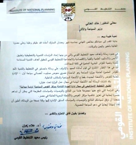– عنوان الرسالة هو تطبيق التخطيط الاستراتيجى فى مجال ادارة الجودة الشاملة بمراكز الغوص السياحية دراسة ميدانية ، والرسالة تحت اشراف الاستاذ الدكتور علاء الدين محمود زهران رئيس معهد التخطيط القومي ، والرسالة تتناول كيفية نشر ثقافة الجودة بين العاملين والوصول بخدمة الغوص والانشطة البحرية لاعلى معدلات الاداء وذلك بتحديد مهمة مراكز الغوص مع رفع مستوى التدريب وتعظيم دور مراكز الغوص فى تنمية النشاط الاقتصادى .